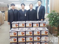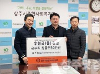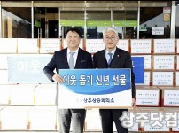 24일 신동우 상주상의 회장(왼쪽)이 조성희 상주부시장에게 기업인들이 마련한 선물을 어려운 이웃을 위해 써달라며 전달하고 있다. 지역의 기업인들이 설을 앞두고 어려운 이웃을 돕기 위해 함께 마련한 선물을 직접 전달해 미담이 되고 있다. 경북 상주상공회의소(회…