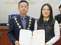 5일 오후 송선재 경북 상주JC특우회장이 임시총회에 앞서 임은혜 학생(우석여고.2)에게 장학금을 전수하고 있다. 이날 장학금은 JC특우회 경북지구에서 각 지역별 모범학생 1명을 선정해 전달하고 있다.