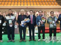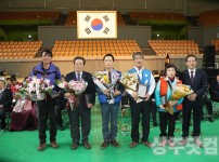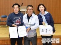 상주시의회(의장 정재현)가 김천시의회 주관으로 지난 2일 김천국민체육센터에서 열린 경북 중서부지역 시군의회 친선체육대회에서 종합우승을 차지했다. 사진은 민지현 김동수 상주시의원이 김세운 경북 중서부지역 의장협의회장(김천시의장)으로부터 수상하는 모습.