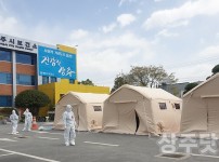 경북 상주시보건소는 코로나19 장기화에 대비하기 위해 22일 보건소 마당에 선별진료소용 음압텐트 3개동을 설치했다. 보건소는 코로나19 유증상자에 대한 진료, 역학조사, 검체 채취를 안전하고 신속하게 할 수 있게 됐다. 음압텐트는 텐트 내부에 음…