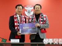 상주상무프로축구단(대표이사 신봉철)이 27일 오전 경북 상주시청을 방문해 코로나19로 어려움을 겪고 있는 주민들을 위해 써달라며 보건용 마스크 500개를 하상섭 행정복지국장(오른쪽)에게 전달하고 있다. 상주상무가 홈 개막전에 사용하려고 준비해둔 것으로, 개막전도…