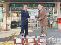 법무부 법사랑 경북 상주지구연합회 박기형 회장(오른쪽)이 24일 함창읍 행정복지센터를 방문해 회원들이 직접 담근 김장김치 10통(20kg)을 신동희 읍장에게 전달하고 있다. 이날 전달한 김장김치는 관내 기초생활 수급자, 장애인, 독거노인 등 10가구에 전달됐다.…