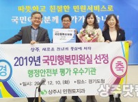 경북 상주시는 행정안전부가 주관하는 올해 국민행복민원실 평가에서 '우수기관'에 선정됐다. 시상식은 10일 경기도청 신관에서 열린 '2019 민원공무원의 날' 행사에서 있었다. 상주시는 민원인 편의시설 확충, 신속한 민원처리를 위한 제도 운영, 친절…